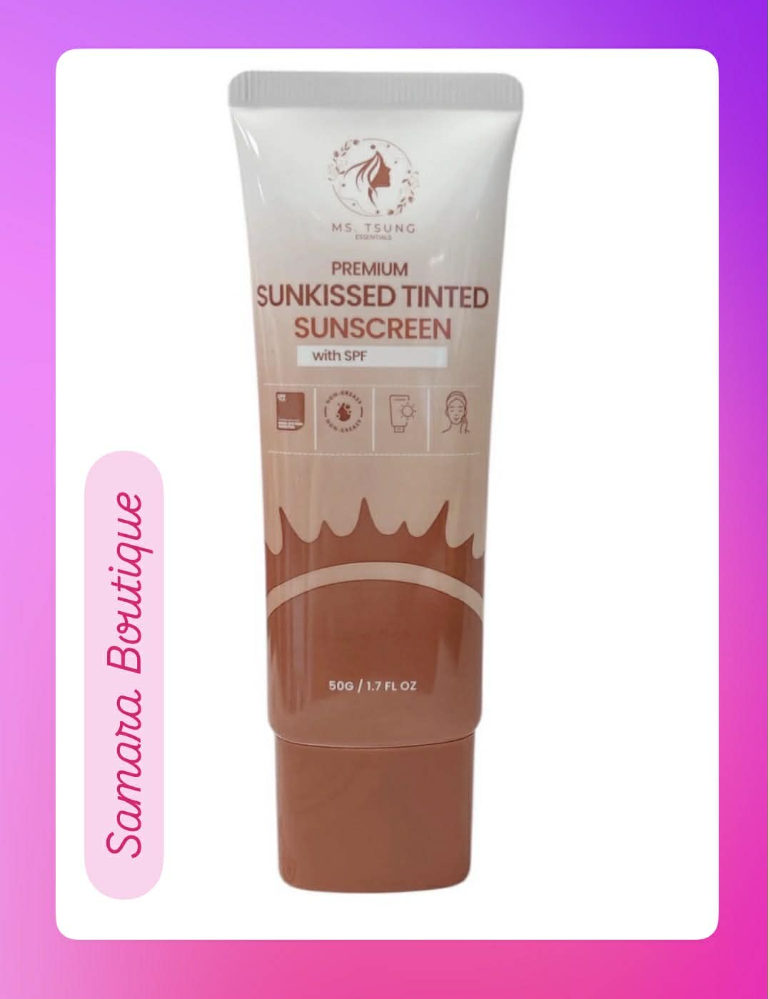 Ms. Tsung Premium Sunkissed Tinted Sunscreen SPF50 delivers broad-spectrum UV protection with a subtle warm tint that evens skin tone while shielding against sun damage. The lightweight 50g formula absorbs seamlessly into skin, providing SPF50 defense without the heavy feel of traditional sunscreens. Infused with nourishing ingredients, this dual-action product simplifies your routine by combining sun protection with light coverage. Ideal for daily wear under makeup or alone, it helps prevent premature aging while maintaining a natural, radiant complexion.